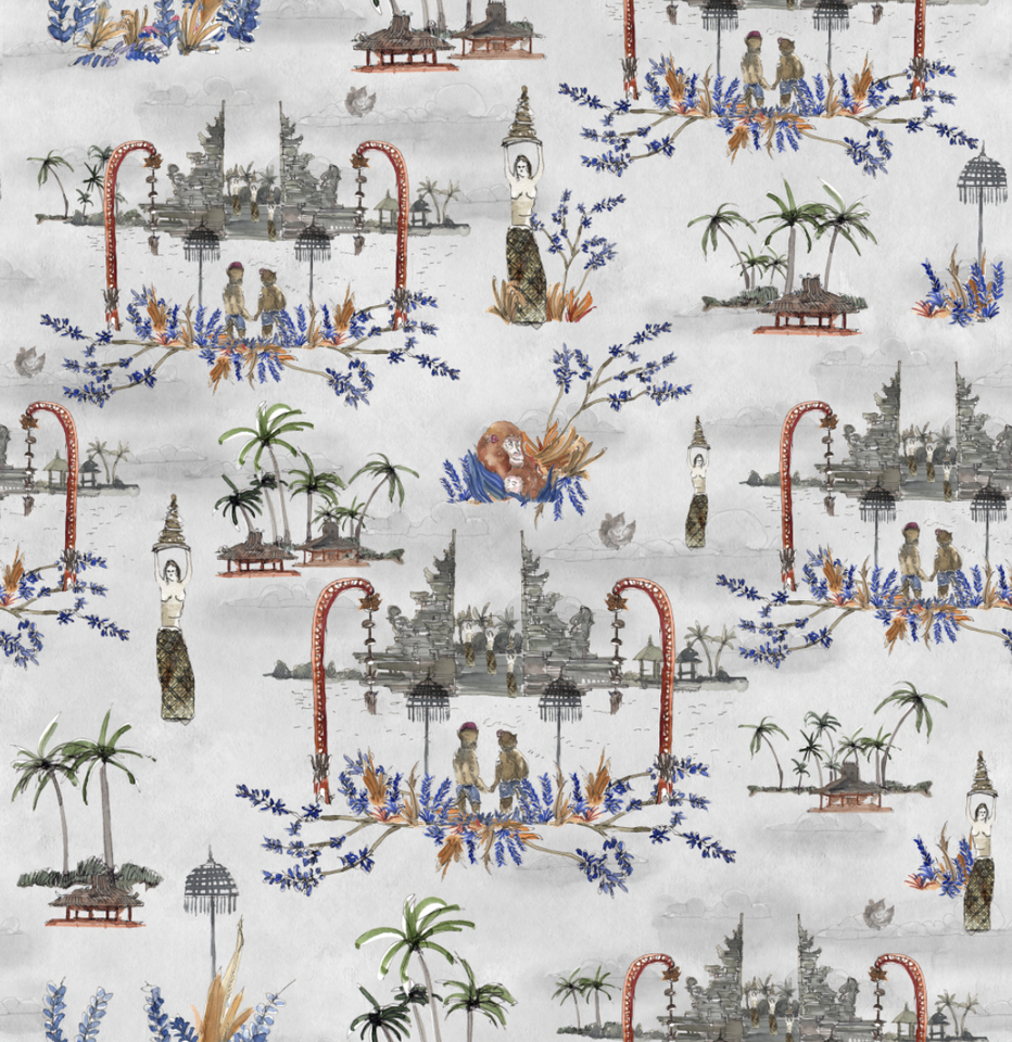 'Bali' collides and translates arts, culture and nostalgia into an enchanting scene that transforms a space into a tropical or exotic gateway. The Balinese women take the centre stage of the design - donning sarong with a geometric Indonesian Batik motifs with distinctive floral pattern.